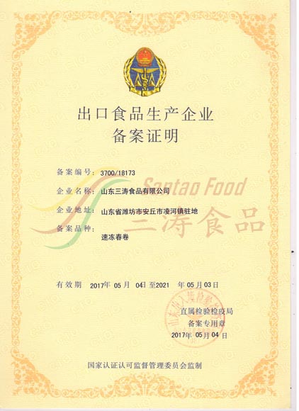 速凍春卷出口備(bèi)案證明