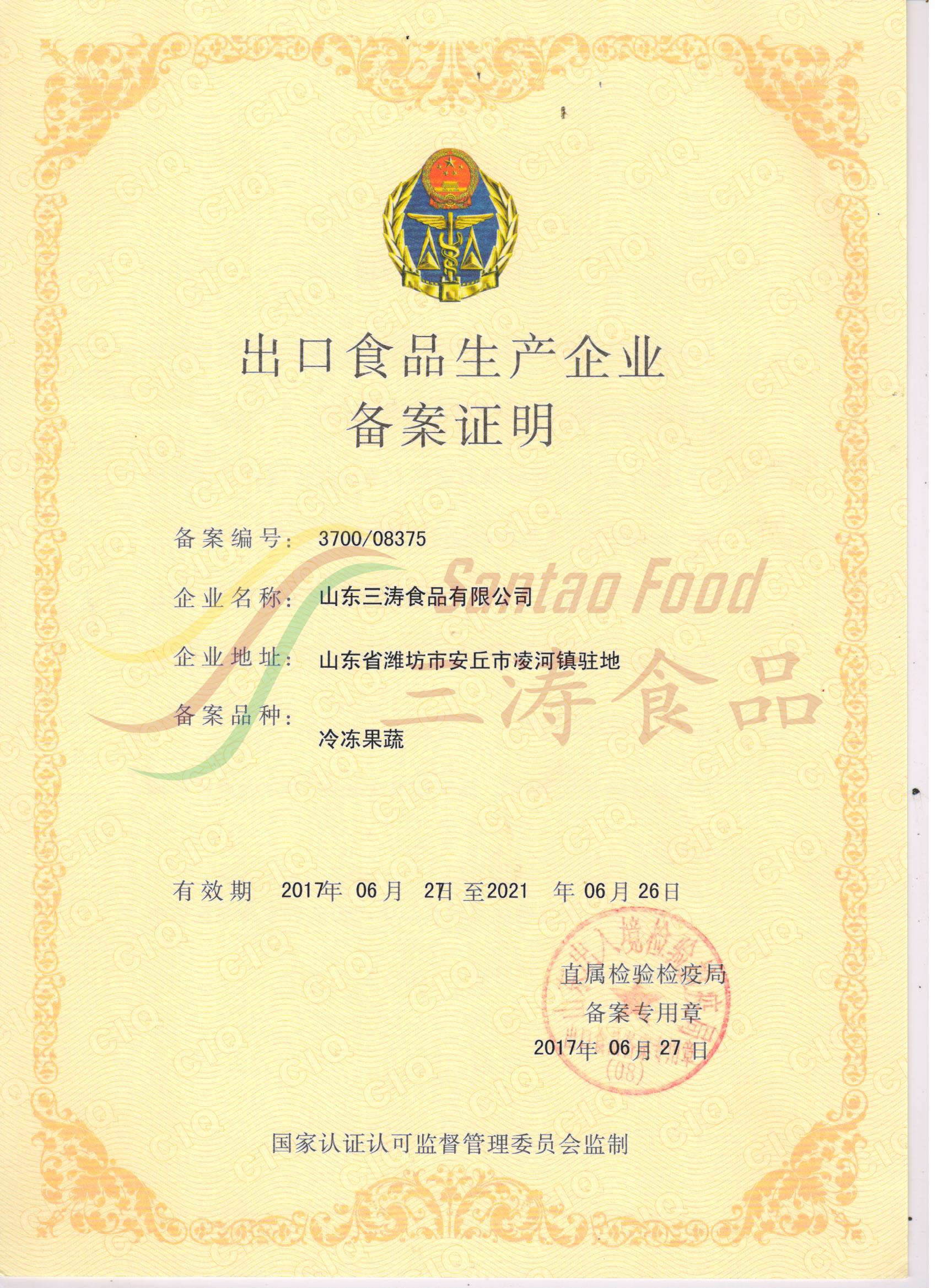 冷凍果蔬出口備案證明